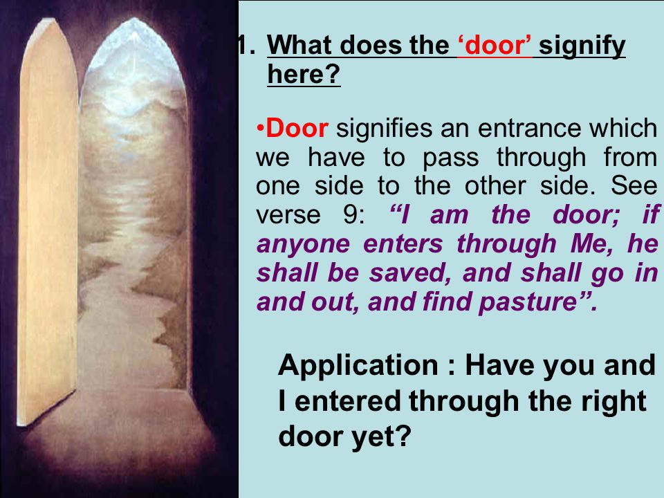 What does the ‘door’ signify here? Door signifies an entrance which we have to pass through from one side to the other side. See verse 9: I am the door; if anyone enters through Me, he shall be saved, and shall go in and out, and find pasture . Application : Have you and I entered through the right door yet?