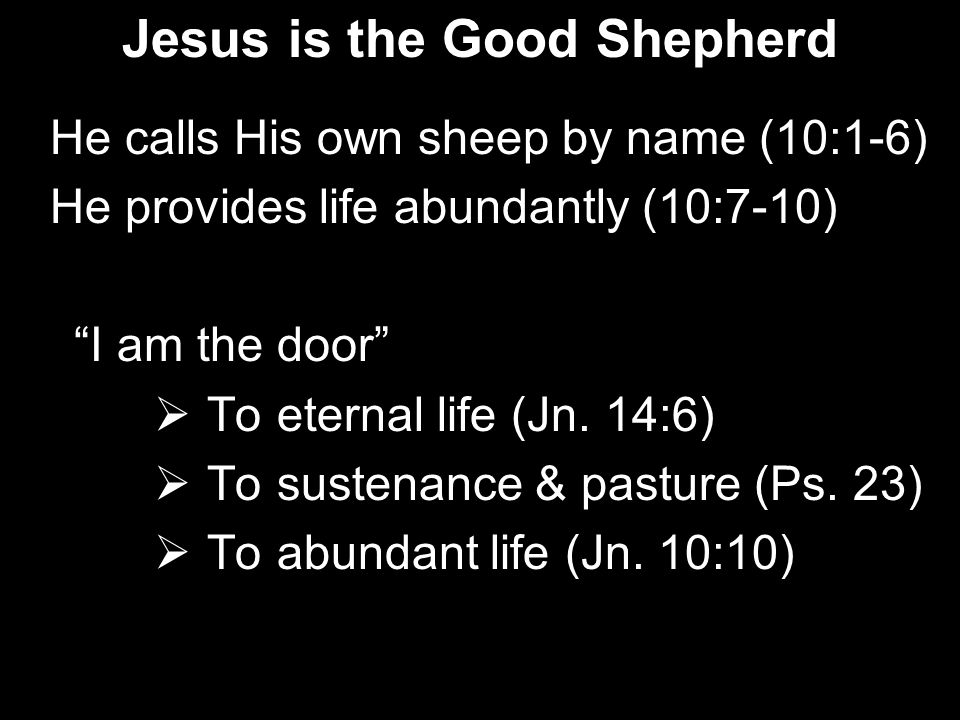 He calls His own sheep by name (10:1-6) He provides life abundantly (10:7-10) I am the door To eternal life (Jn. 14:6) To sustenance & pasture (Ps. 23) To abundant life (Jn. 10:10)