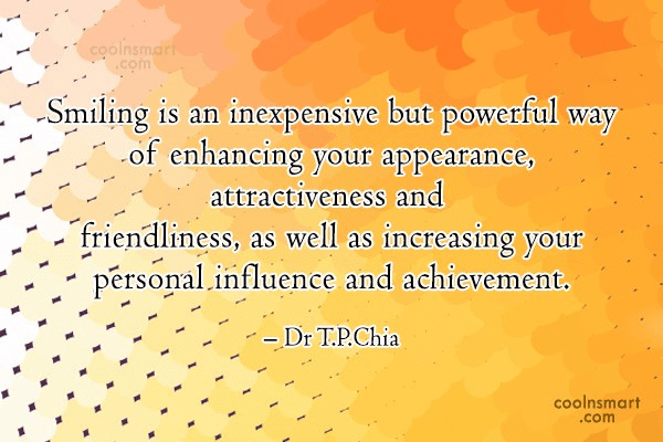 Smiling is an inexpensive but powerful way of enhancing your appearance, attractiveness and friendliness, as well as increasing your personal influence and achievement. – Dr T.P.Chia